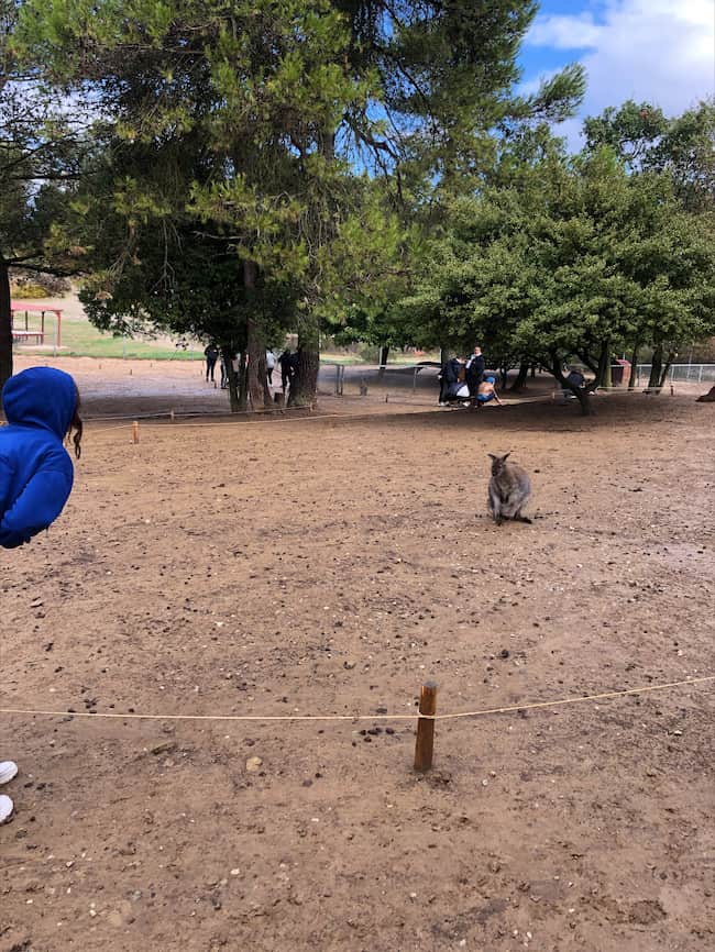 - balade dans l’enclos des wallabies. Le long d’un chemin au milieu du territoire des wallabies, nous leurs donnons à manger et pouvons même en caresser certains.